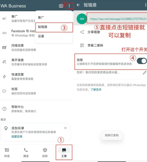注册完成 WhatsApp Business 账号之后,点击【工具】— 右上角【⋮】— 【短链接】 — 【打开接收信息的按钮】— 点击短链接进行复制