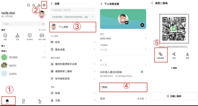 1、打开 LINE — 【主页】— 【个人资料】—【二维码】 — 【复制链接】