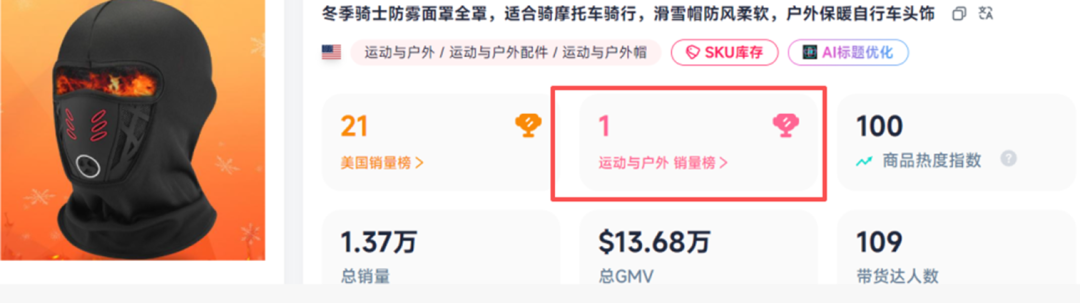 FastMoss的数据表明,在1月2日至1月8日这一周内,这款保暖面罩共计售出1.22万件,销售总额高达12.25万美元(折合人民币约85万元),一举登顶TikTok美国区运动户外类目销量榜榜首。直至现在,该单品热度不减,持续稳居类目销量前十,已然成为冬季跨境电商的热门之选。