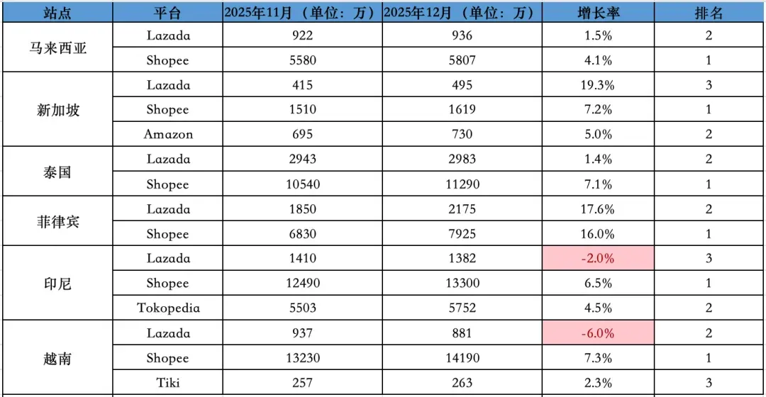 数据显示,2025年12月,Shopee在东南亚六国的月度总访问量约为5.41亿次,环比增长约7.9%。在进入相对成熟期后,Shopee仍能在双12节点实现显著增长,反映其在日用品、高频消费和大件商品领域的货架电商基本盘依然稳固。