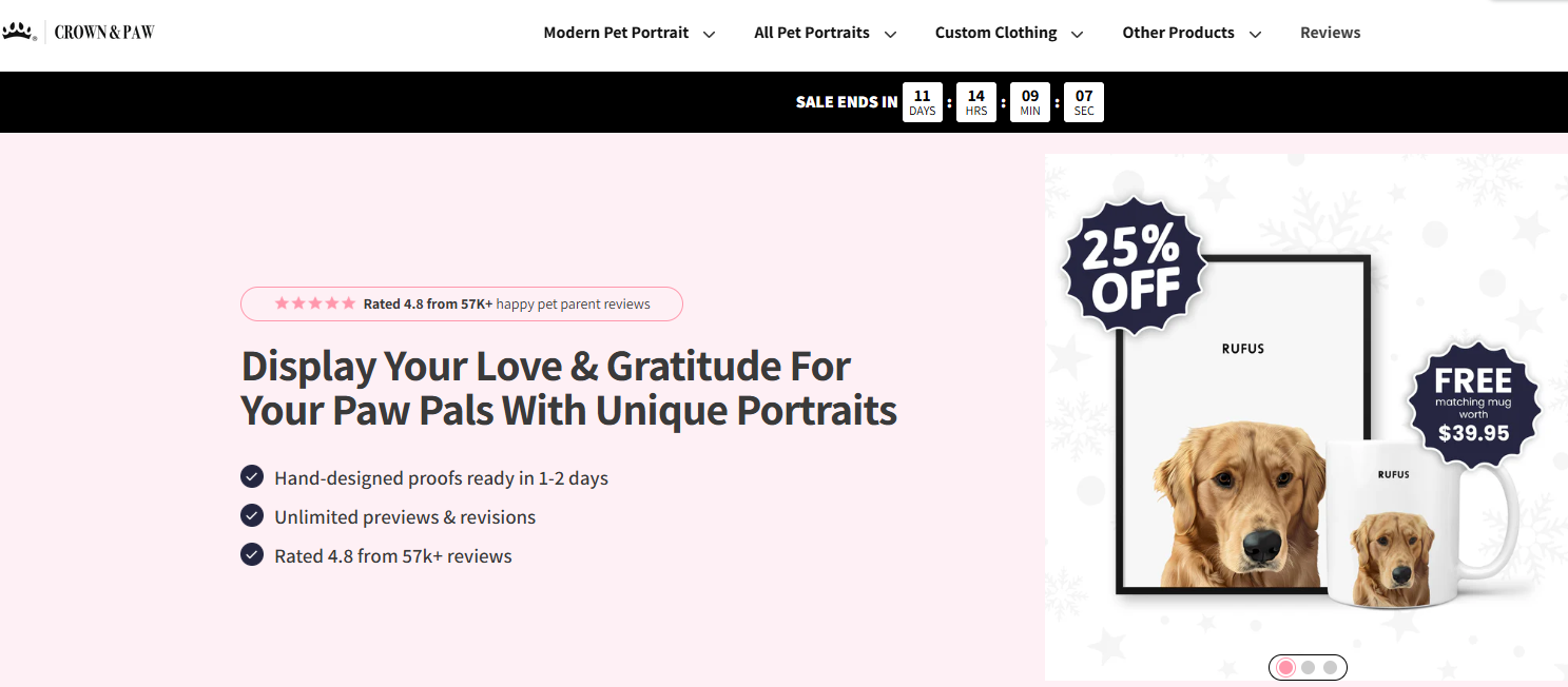 其次,如今海外宠物市场不断扩大,Crown & Paw聪明地选择了宠物肖像的形式,避开了与老牌宠物独立站的竞争,从而打出了自己的独特风格。
