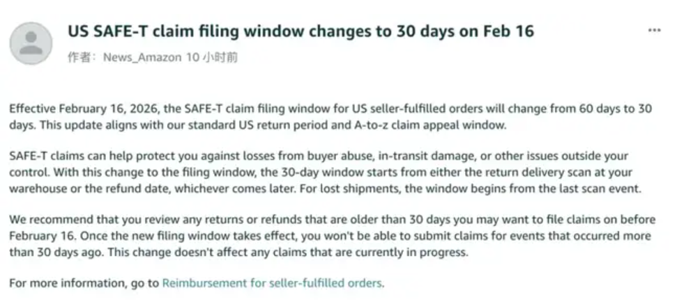 近日,亚马逊发布公告称,从2026年2月16日起,美国卖家自配送订单(Seller-Fulfilled Orders)的SAFE-T索赔申报期限将从原来的60天缩短至30天。