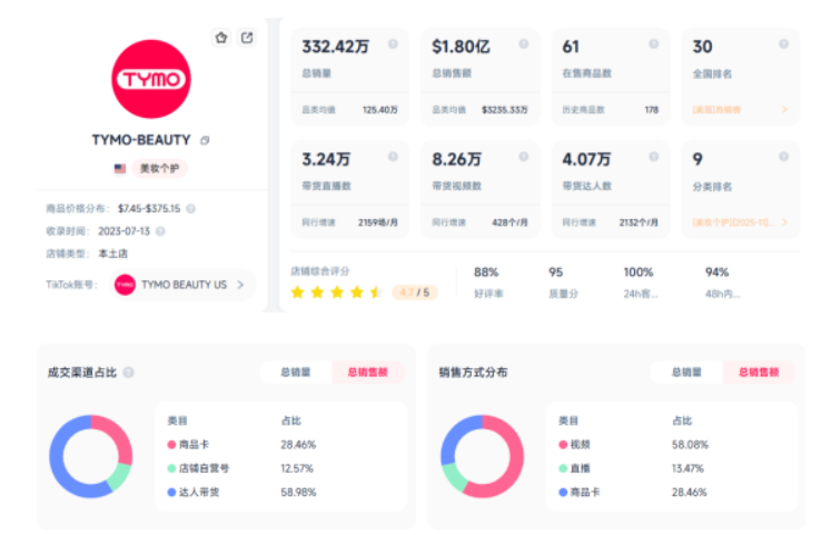 截至 2025 年末,TYMO BEAUTY 品牌在 TikTok Shop 美区的销售额总计达到 1.8 亿美元,总销量为 332.42 万件,实力不容小觑。