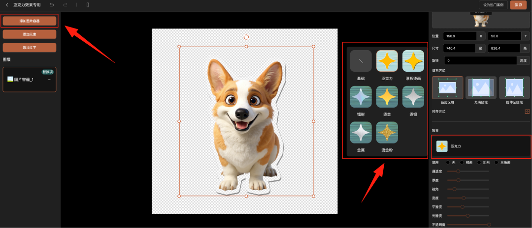 添加图片容器,在右侧选择亚克力效果,保存模板,即可快速应用到其他设计中。