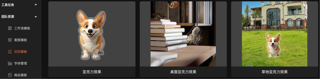 3. 一键抠图与合成:将转绘后的图片一键抠图,导入印花合成功能,并选择“亚克力特效模板”,即可快速生成亚克力效果的设计图。