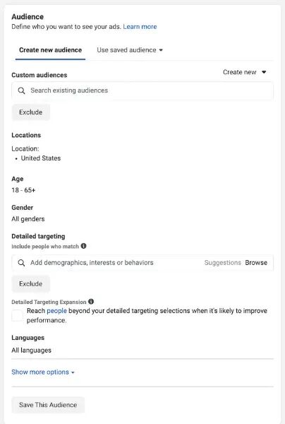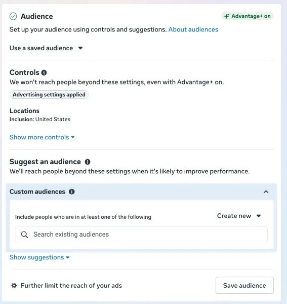 当你查看 Meta 广告中的受众控制(Audience Control)仪表盘时,会发现即便是在使用 Advantage+ 的情况下,你仍然可以通过多种方式进行手动受众定向。