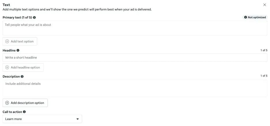 Meta 允许你为标题、文案描述等元素添加多个选项,系统随后会预测并投放表现最优的组合。