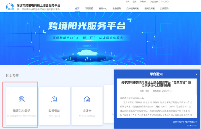日前,深圳市商务局发布通知,已对深圳市跨境电商线上综合服务平台"无票免税"登记功能进行了优化升级,并于2026年2月1日正式上线运行。