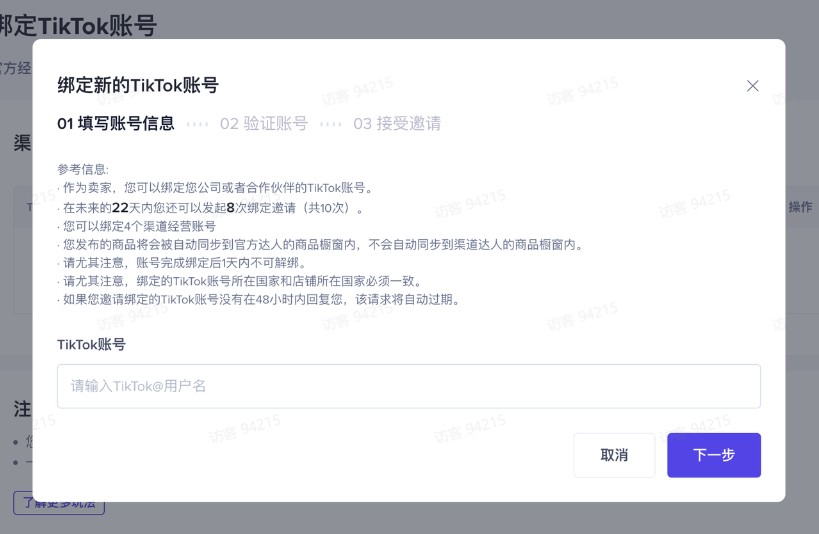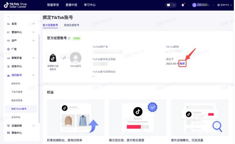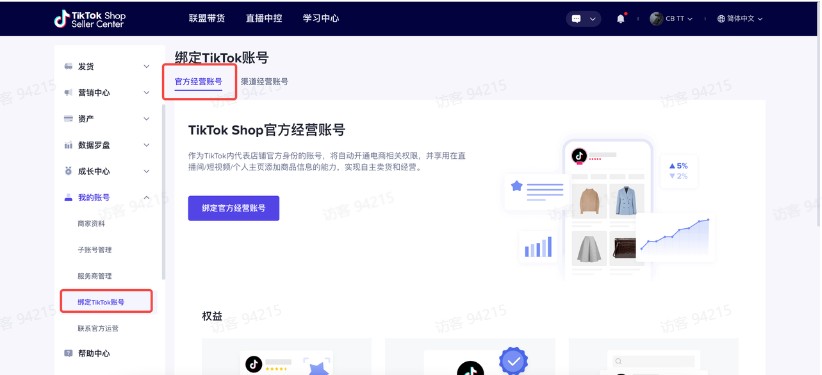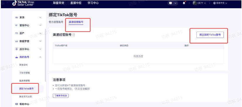 https://seller.tiktokglobalshop.com/homepage?shop_region=GBStep2:我的账号-绑定TikTok账号-渠道经营账号