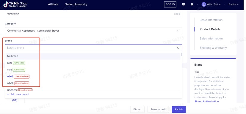 资质已提交过审的品牌,品牌下⽅显⽰Authorized字样,⽤⼾会在商品详情⻚看到品牌字段。 资质未提交过审的品牌,品牌下⽅显⽰Unautl 2样,不会在⽤⼾端透出。