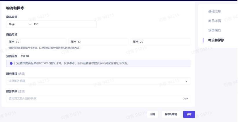 输⼊商品信息后将展⽰预估费⽤,仅供参考,实际运费会根据卖家和买家的地址⽽改变。服务期限&服务条款(选填)