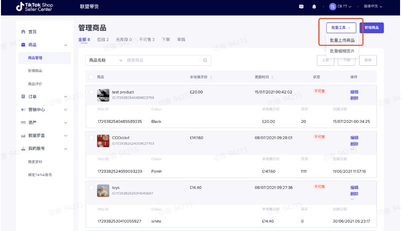 打开https://seller.tiktokglobalshop.com/product,点击商品>管理商品,点击右上⻆”批量⼯具-> 批量上传商品