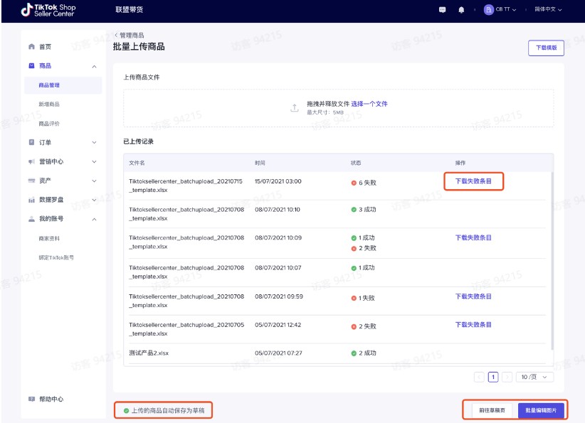“下载失败条⽬“仅包含此次上传失败的商品,⽂件中上传成功的商品将保存⾄“商品->草稿”