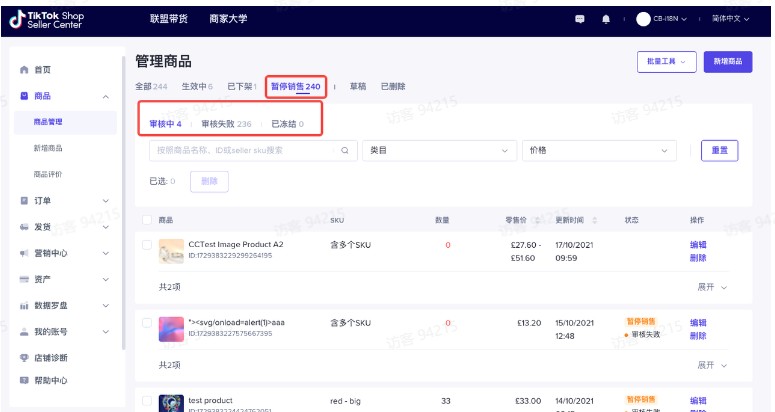 审核中:平台正在审核中的商品。此状态下商家可以编辑,编辑后的商品将会重新进⼊平台审核。