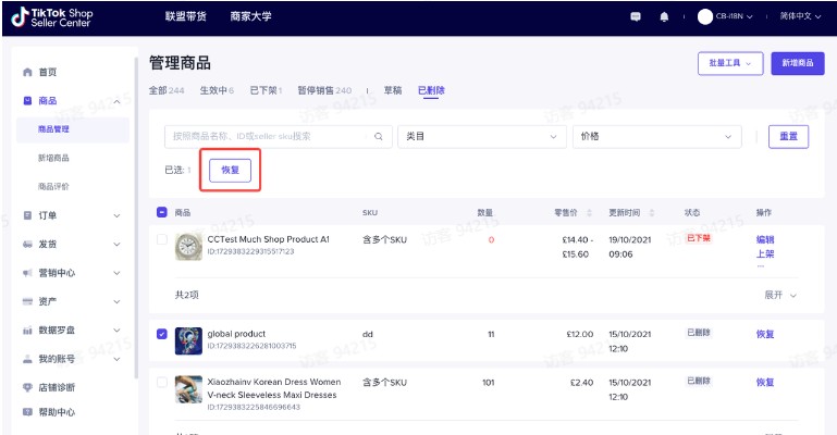 已删除:已经被删除的商品,可以点击“恢复”将其恢复,礼被恢复的商品将回到下架列表中