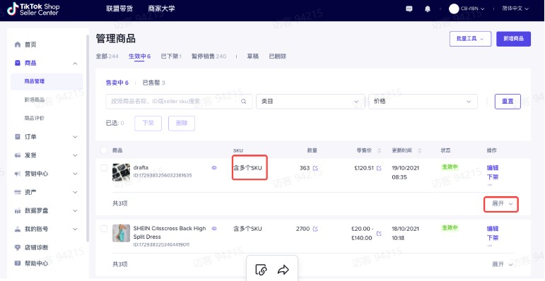 打开https://seller.tiktokglobalshop.com/product/rating,点击商品->商品评价商品评价⼊⼝