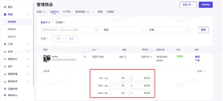 在线的商品可以进⾏编辑、删除、下架、修改商品价格和库存的操作。编辑后,编辑后的商品需要平台重新审核通过后⽅可⽣效