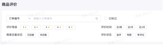 筛选:可通过标记、评价等级、评价时间、商家回复状态选、评价状态进⾏筛选