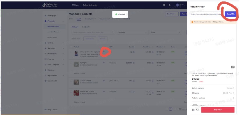 从【seller center-Manage products】中复制产品URL粘贴到对应框中,完成商品添加