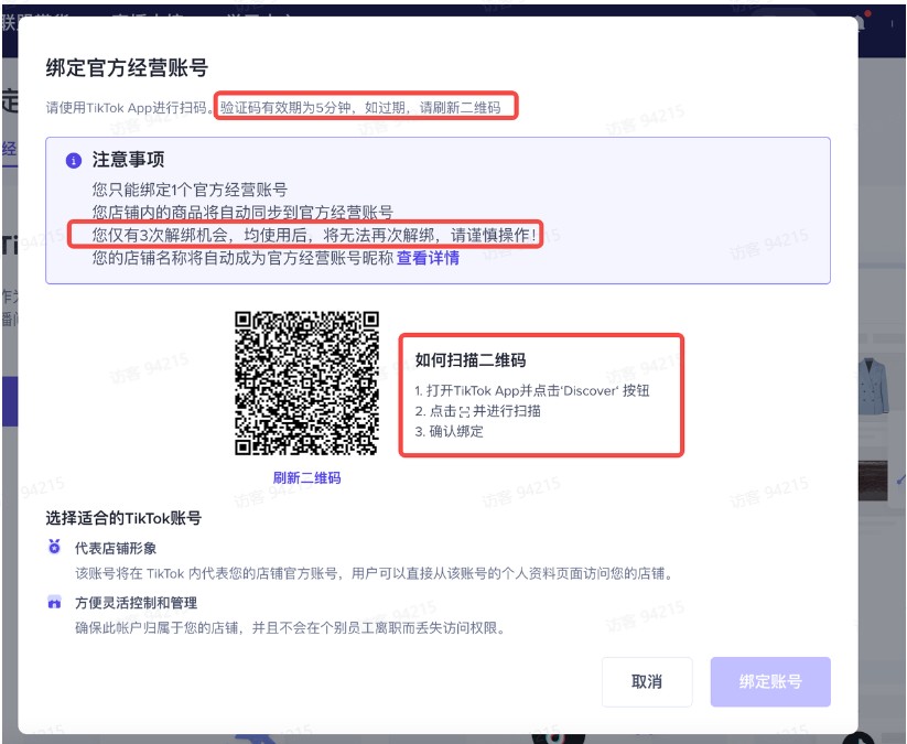 TikTok所在国家和地区与店铺经营国家和地区必须⼀致(含TikTok注册地址与⽹络⽬前所在地址) 3.官⽅账号(历史总共可解绑3次)绑定操作流程