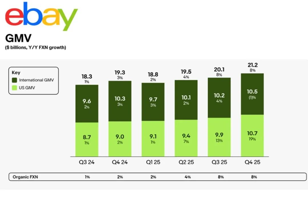 eBay于近期也悄悄发布了其2025年的财报数据,并不美观。首席执行官Jamie Iannone表示,公司2025年全球总商品交易额(GMV)增长近6%,达约800亿美元,其中美国GMV增长近10%。
