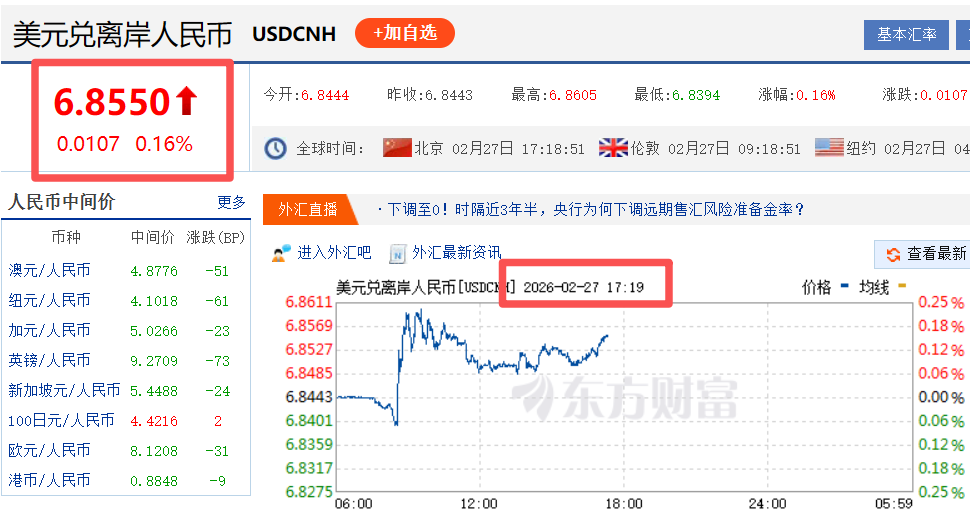 2月26日,离岸人民币兑美元强势升破6.84关口,最高触及6.835,延续2025年12月以来的偏强走势,创下2023年以来的新高;