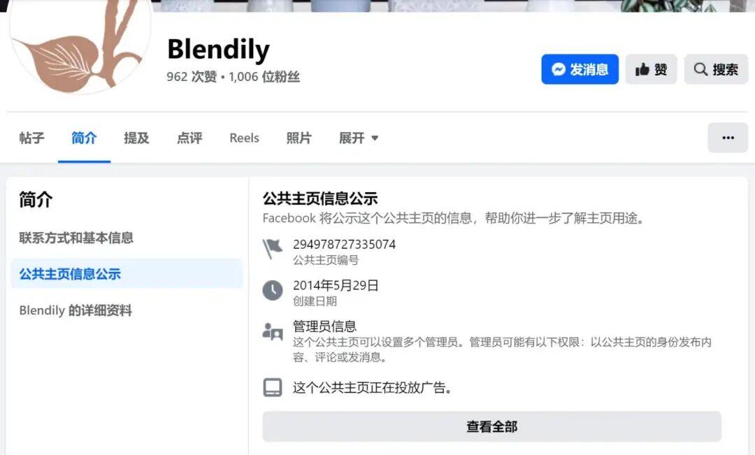 例如,要查看护理品牌Blendily投放的广告,可以访问其Facebook商家主页,并向下滚动到“公共主页信息公示”部分。