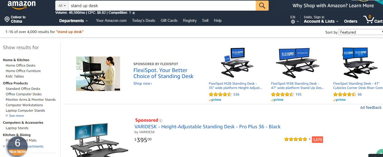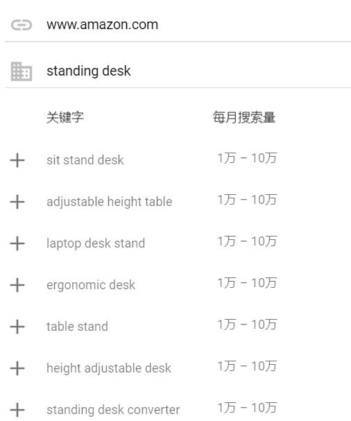 以站立式办公桌这个品类举例来说,"standing desk"这个词在亚马逊上的搜索量在每月1万到10万之间,而且相关词非常多,"adjustable standing desk"、"sit stand desk"、"standing desk converter",每一个都有相当大的搜索量。这说明这是一个需求旺盛的品类。