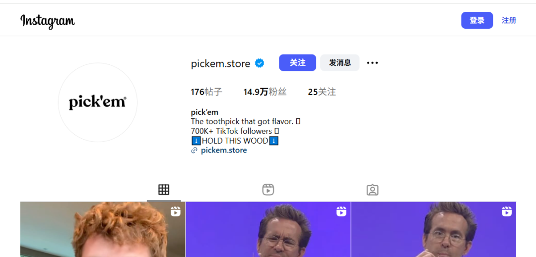 在Instagram上,pick'em粉丝数量近15万,围绕“让叼牙签变成潮人标配”这一核心,发布高爽视觉冲击、低门槛挑战等类型内容,其视频主页仅留一个链接,帮助用户直达独立站,完成潜在粉丝转化的同时也提高了产品订单量。