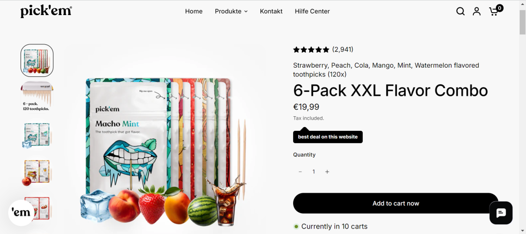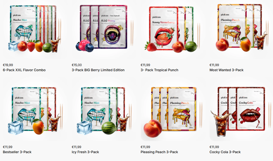 其中,一款最畅销的牙签组合售价19.99欧元,包含了薄荷、可乐、芒果三种口味,要知道在欧洲,一条法棍面包的售价才1欧元左右,20欧元大约相当于一餐外卖或两张电影票的钱,甚至足以把一周的日常必需品一次性配齐,可见利润有多大。