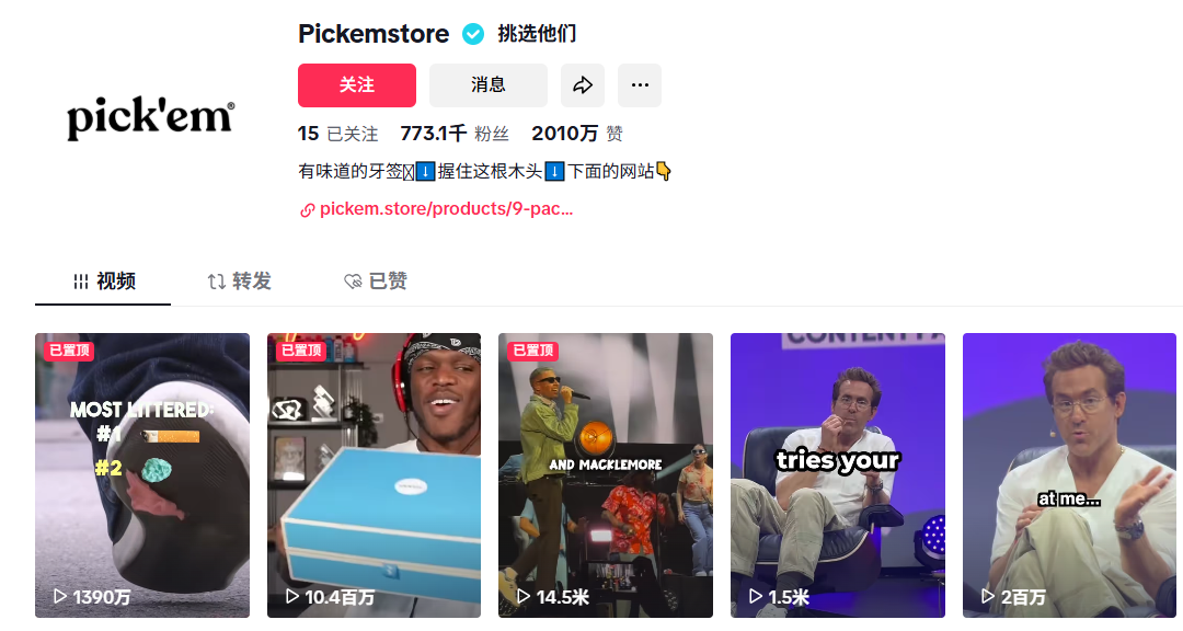 在TikTok上,pick'em拥有77.3万多个粉丝,你刷到的Pick’em内容从来不是硬广,而是名人品尝repo、创意挑战赛、UGC主动分享等一系列,以牙签为支点的充满Tik Tok风格的原生内容。
