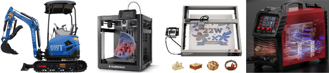 微型挖掘机走进欧美家庭农场与庭院改造场景,激光雕刻机成为个性化定制与创业工具,3D打印设备进入创客教育与家庭创作领域,便携焊机则在车库维修与DIY市场快速普及。电商平台上,相关产品在众筹与线上销售渠道屡次获得超预期反响,桌面CNC小型机床的市场潜力正在被不断验证。