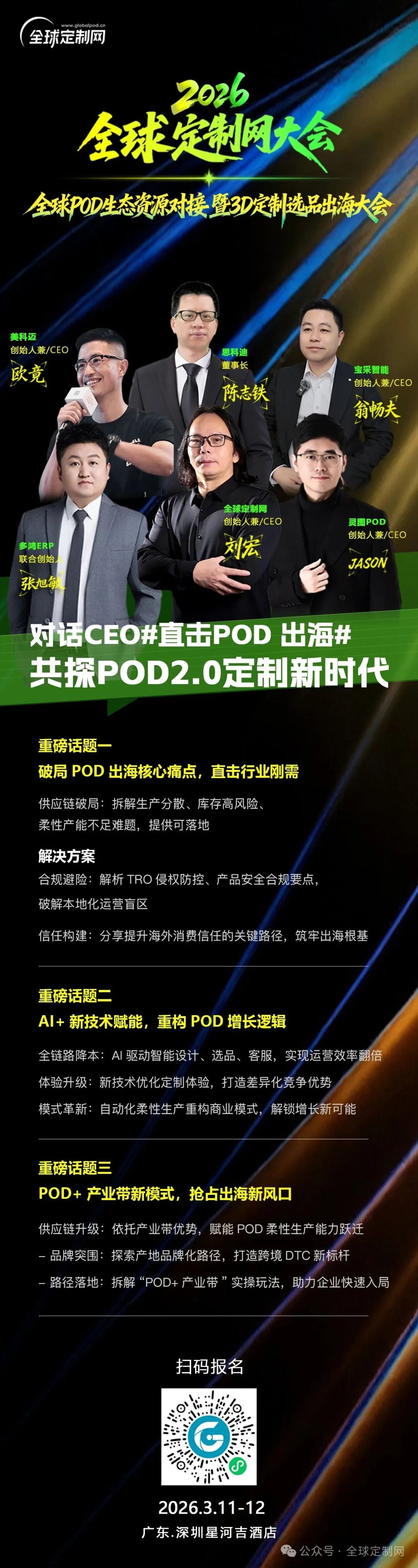 本次访谈由全球定制网CEO 刘宏亲自主持,汇聚5位深耕POD出海、供应链、AI技术等领域的头部企业CEO,他们带着一线实战经验,拆解行业痛点、分享前沿布局,用实战视角赋能出海之路: