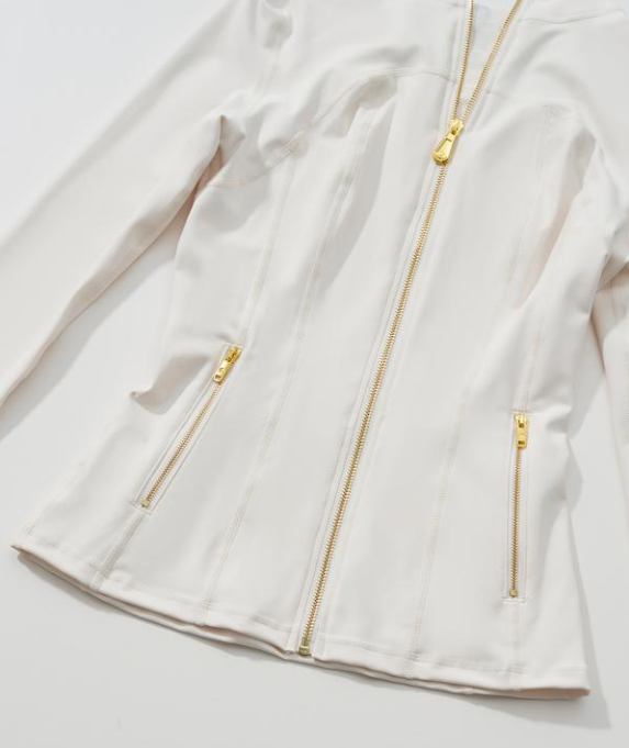 细节处的巧思更是加分项:金色拉链口袋方便外出携带小物件,袖口拇指孔设计避免运动时上滑,宽松廓形兼顾舒适度与运动自由度。值得注意的是,其设计风格与Lululemon的Define运动夹克套装高度相似,凭借高性价比,成为大牌平替的优质选择,也为后续爆单埋下了伏笔。