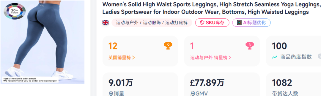 在TikTok美区,除了这款爆火的女士瑜伽套装,多款运动服饰同样表现亮眼:单价49.99美元的女士高腰瑜伽裤,7天销量超7100单,周销售额达35.67万美元;男士运动T恤也呈现持续上涨趋势。而在欧洲市场,春季女士运动服饰同样是热门单品,Easy Yoga跨境品牌的女士高弹力无缝瑜伽裤,成功登顶英国、西班牙、德国等多个站点的类目销冠,仅英国站点总销量就突破9万单。