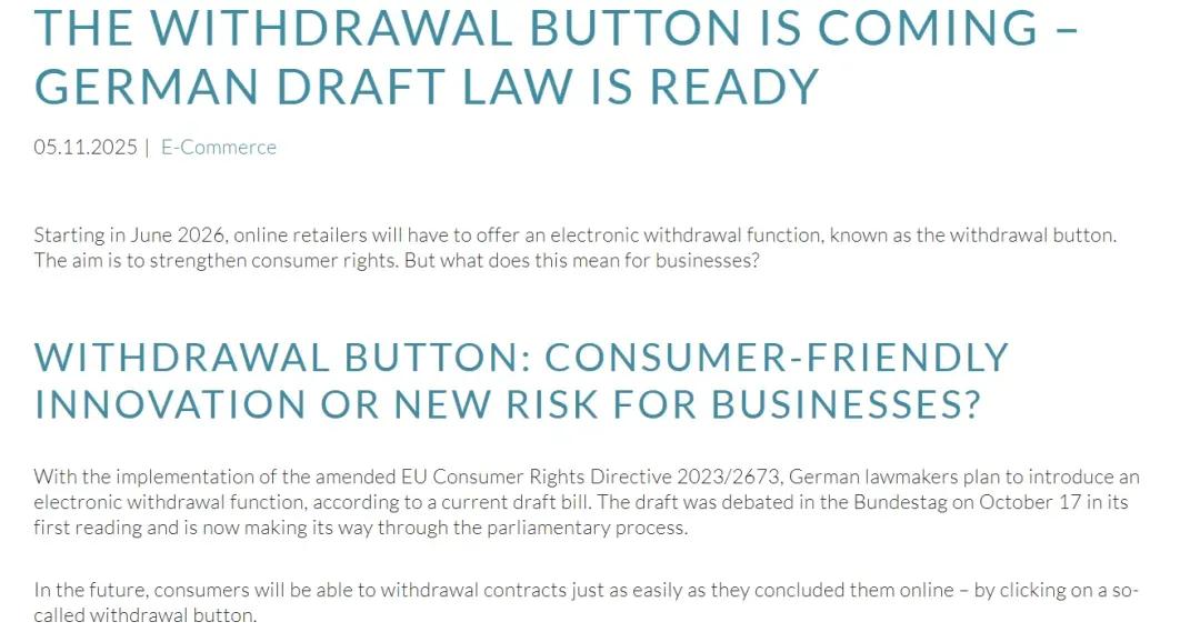 这项政策里明确表示:所有面向欧盟市场的所有在线商店、电商平台均需强制设置清晰可见的一键退货按钮。