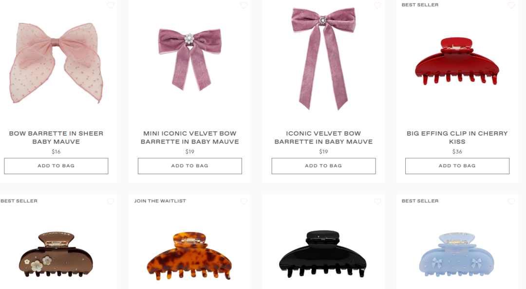 她们的定位很清晰:做日常、轻松、高级的发饰,让头发变得有趣。产品线从发夹到发带再到特色发圈,走的都是可爱甜美路线,颜色和细节都把少女心拿捏得死死的。