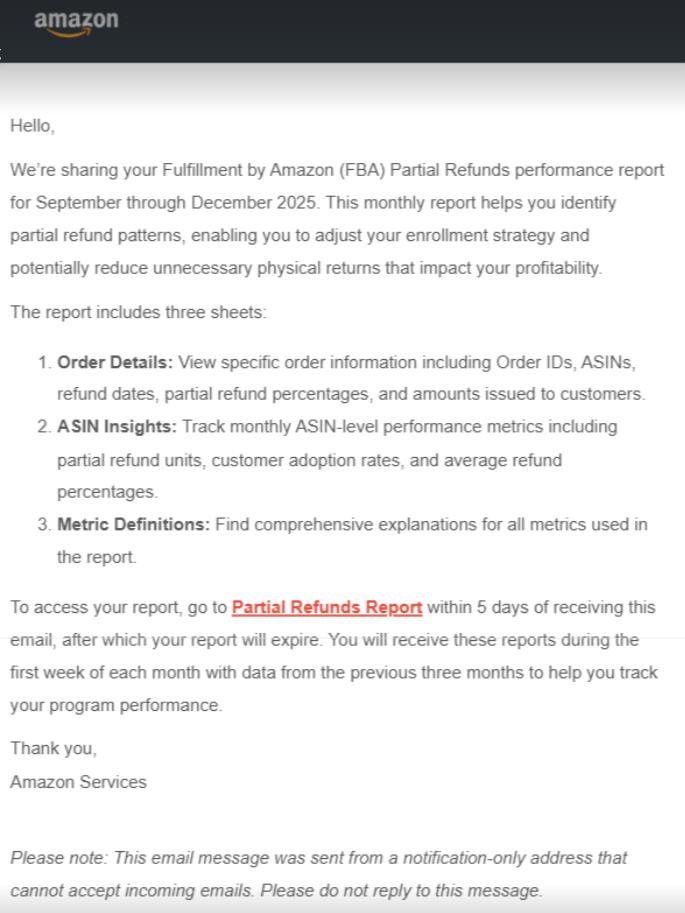 针对卖家关注的“部分退款”功能,亚马逊从2026年起, 将通过邮件形式每月给卖家发送绩效报告,旨在帮助卖家了解注册部分退款商品的退货数据。