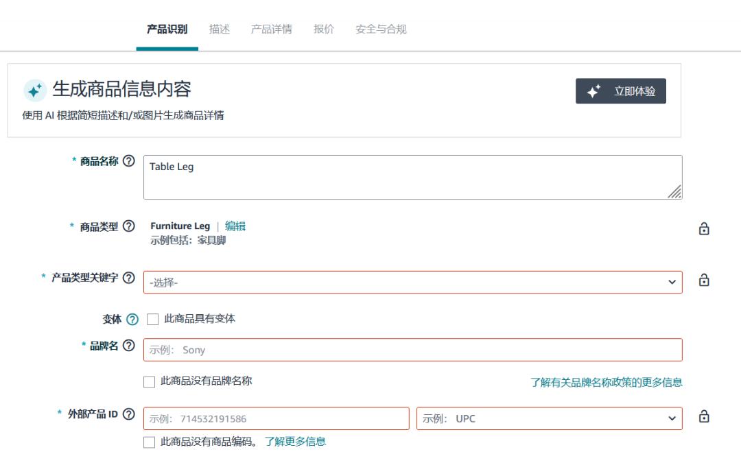 (1)输入您的品牌名称和零配件相关信息。在“外部产品ID”行,在右边下拉菜单选择“UPC”。
