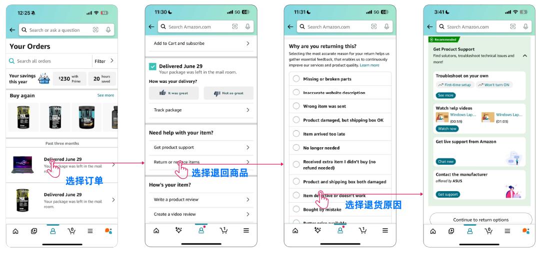 点击“退回或更换商品”后,勾选退货原因,自动弹出商品支持页面。