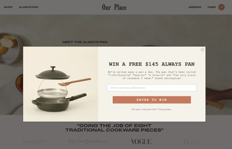 它们也是收集潜在客户信息的绝佳途径,可以通过提供内容或折扣来换取客户的联系信息。例如,访客进入 Our Place 的主页几秒钟后,就会看到一个弹出窗口,宣传免费赠品活动。
