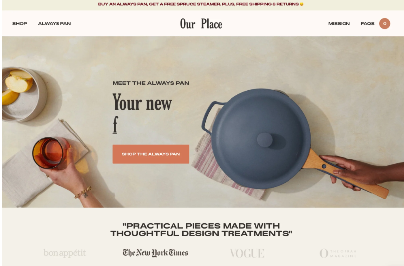 例如,再看看 Our Place 的主页:它有一个欢迎栏,向访客介绍折扣和免运费优惠。
