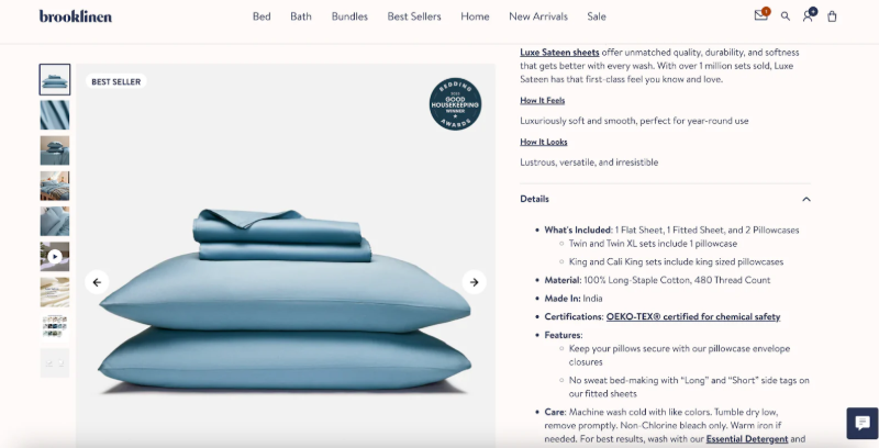你要超越营销文案的局限,像数据库一样思考:每个尺寸、材料、用例是否都以清晰、客观的方式呈现?这些系统喜欢事实,而基于事实构建的页面更容易被引用。Brooklinen 在这方面做得很好——它们不仅包含吸引人的文案(如获得《好管家》杂志奖),还提供丰富的事实细节:床单的触感和外观、每种尺寸的精确尺寸、材质、功能、认证以及保养方法。这是一个信息丰富的产品页面,解答了你所有的问题。