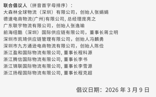 此封倡议书是由10家头部物流公司发起,包括大森林、德速电商、联宇物流、前海纽酷、凯琦供应链、九方通逊、盈和国际、腾信国际、锦联国际、扬程国际。