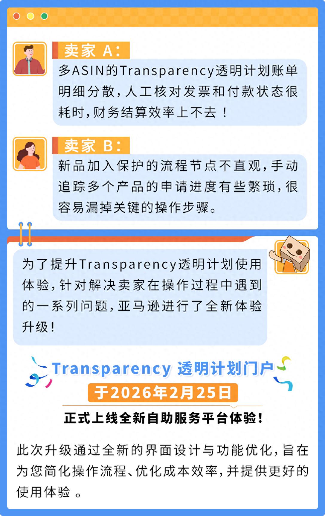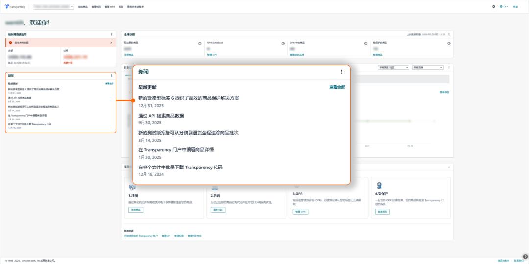亚马逊 Transparency 透明计划始终致力于为卖家提供高效的品牌保护 。随着 2026 年 2 月 25 日 全新自助服务门户的上线 ,亚马逊全面优化了卖家的运营体验,助您实现品牌长期稳定的增长 。