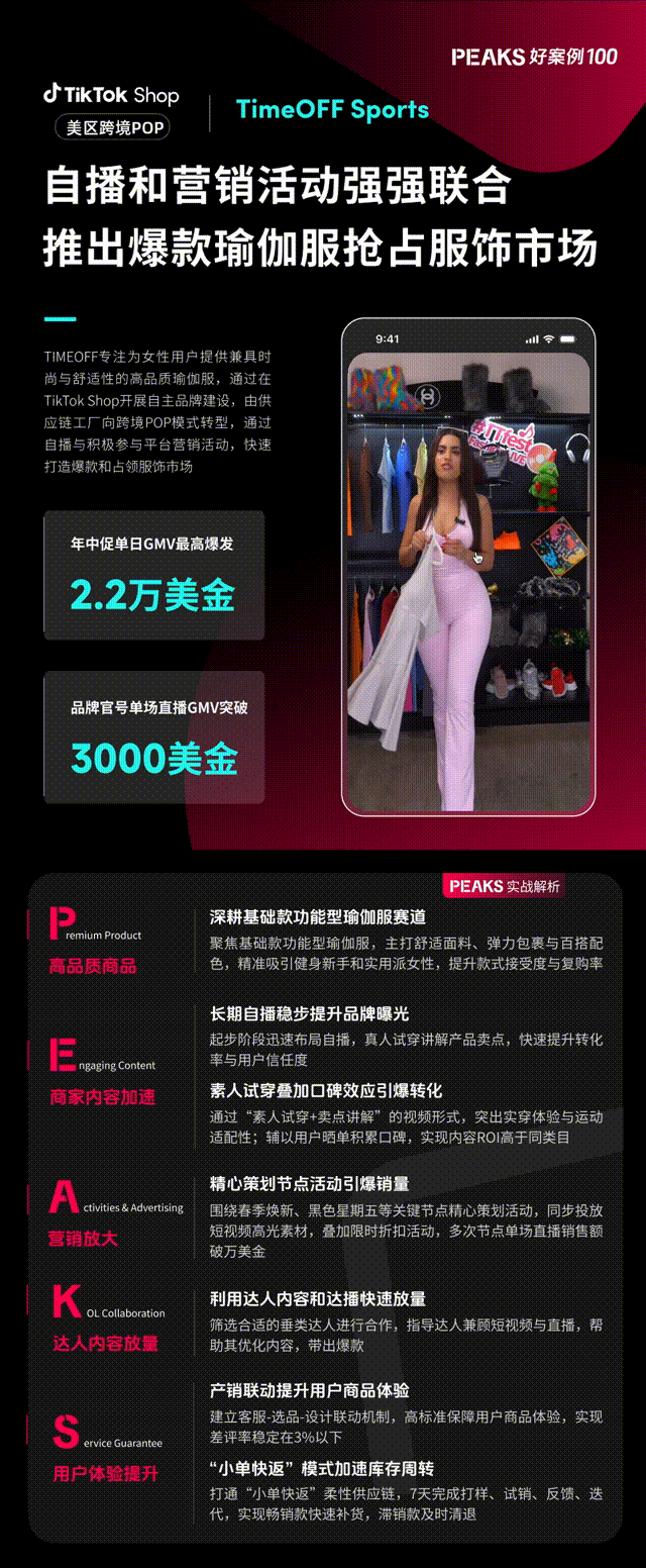 基础款功能型瑜伽服借助自播实穿展示与平台节点活动,快速被打造成爆款,年中促单日GMV最高爆发2.2万美金