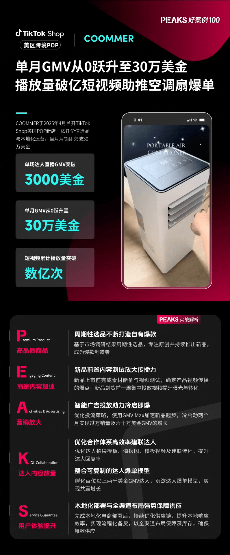空调扇等季节性家电依靠前置素材储备与智能广告投放,冷启动月销售额从0跃至30万美金,短视频收获数亿播放