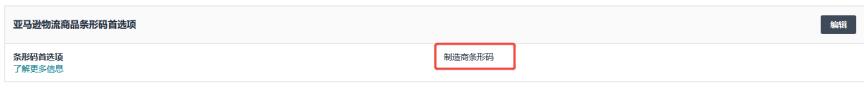设置->亚马逊物流->下拉至【亚马逊物流商品条形码首选项】->【编辑】->更新为【制造商条形码】