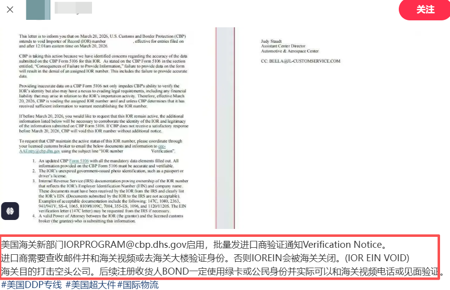 部分进口商必须提交资料备案,接受视频或当面验证身份,要是没按要求完成,CBP会直接废止该IOR编号的使用效力。