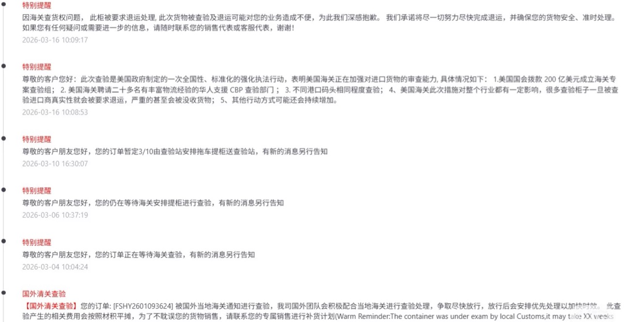 初海视野发现,在3月16日,物流商给卖家发了个“特别提醒”,透露了当前美国海关查验的现状: